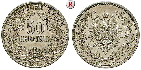 50 Pfennig 1877 J. J. 8; vorzüglich / vorzüglich-stempelfrisch, kl. Kratzer auf Vs.