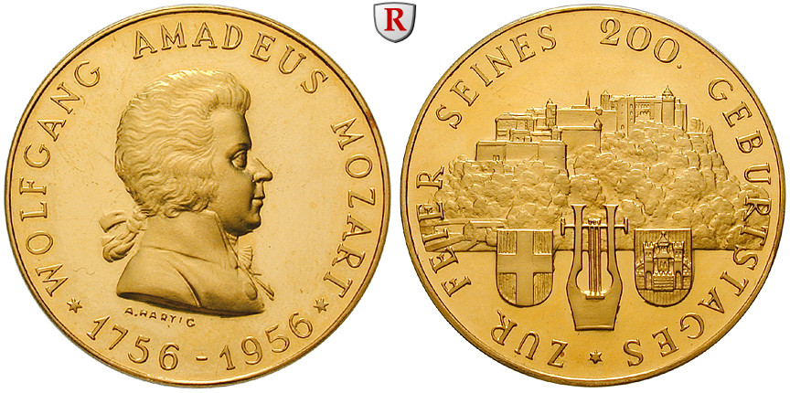 Mozart, Wolfgang Amadeus - Österreichischer Komponist 1756-1791. Goldmedaille 35,8 mm 31,58 g fein, 1956. von A. Hartig, auf seinen 200. Geburtstag. Büste nach rechts / Ansicht der Feste Hohensalzburg, darunter Lyra und zwei Wappen. Niggl 1381; GOLD, Polierte Platte, berührt