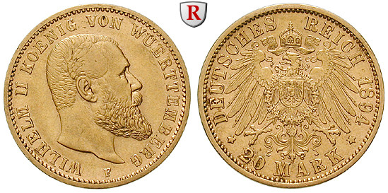 Wilhelm II. 1891-1918. 20 Mark 1894 F. J. 296; GOLD, sehr schön +, Druckstelle auf Vs.