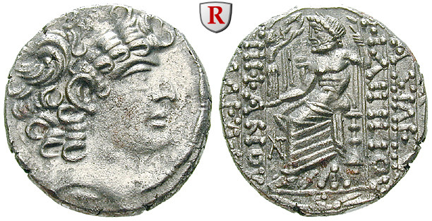 Philippos Philadelphos 89-83 v.Chr. Tetradrachme Jahr 20 = 30-29 v.Chr. Antiochia. Kopf r. mit Diadem / Thronender Zeus hält Zepter und Nike, Beizeichen Monogramm im l. Feld und Datierung K im Abschnitt. RPC 4137; vorzüglich, l. Korrosion auf Vs.
