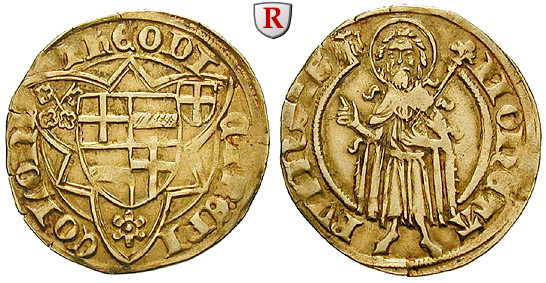 Dietrich II. von Mörs 1414-1463. Goldgulden o.J. (1415) Bonn. Im Dreipaß Schild Köln/Mörs, in den Winkeln gekreuzte Schlüssel, das Stiftskreuz und eine Rosette / Stehender Johannes der Täufer mit Stab. Friedb. 793; GOLD, sehr schön
