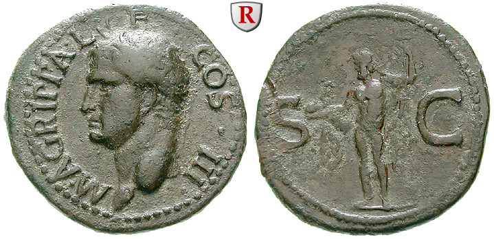 Agrippa 63-12 BC. Copper-As 30 mm 37-41 Rome. Head left, wearing rostral crown M AGRIPPA L F COS III / S C Neptune standing left, holding trident and dolphin. RIC 58; very fine to extremely fine / very fine