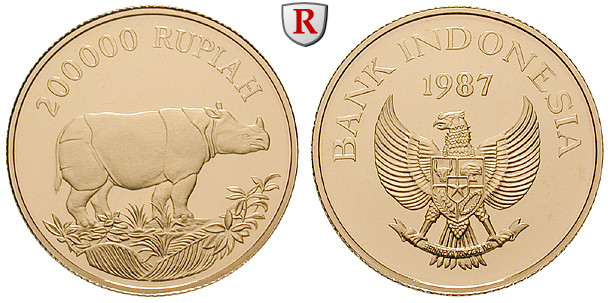 200000 Rupiah 9,16 g fein, 1987. WWF - Nashorn. Friedb. 7; GOLD, Polierte Platte