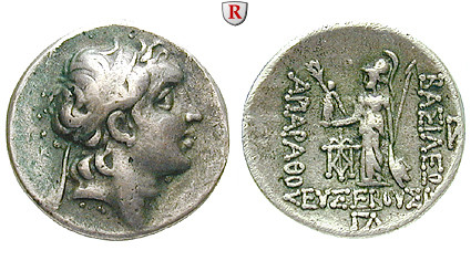 Ariarathes IV. 220-163 v.Chr. Drachme 17 mm Jahr 33 =188/7 v.Chr. Kopf r. mit Diadem / Athena l. mit Speer und Schild, Schild mit Gorgoneion verziert, in der r. Hand trägt sie eine Nike l., die einen Kranz hält; im Feld Monogramme, im Abschnitt Datumsangabe. Simonetta 13f.; sehr schön