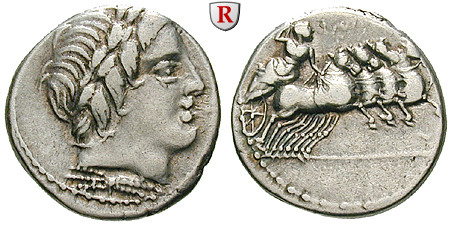 Anonymous 86 BC. Denarius 19 mm 86 BC Rome. Laureate head of Apollo right, thunderfolt below / Jupiter in quadriga right, hurling thunderbolt. Cr. 350A/2; good very fine