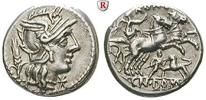 Cn. Domitius Ahenobarbus 128 v.Chr. Denar 18 mm 128 v.Chr. Rom. Behelmter Kopf der Roma r., dahinter Kornähre, davor Wertzeichen / CN DOM ROMA Victoria in Biga r., darunter Kampf zwischen einem Mann und einem Löwen. Cr. 261/1; fast vorzüglich