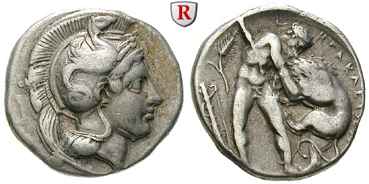 Stater 21 mm 420/415-390 v.Chr. Kopf der Athena mit attischem Helm r., auf dem Helmkessel Hippokamp / Herakles kämpft mit dem Nemeischen Löwen; Keule, Bogen und Kornähre im l. Feld. HN Italy 1371; sehr schön +, kl. Stempelfehler auf Rs.