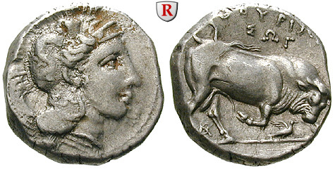 Stater 20 mm 350-300 v.Chr. Kopf der Athena r. mit attischem Helm, dekoriert mit Skylla / Stier stößt r., SWG darüber, Vogel und AR darunter. HN Italy 1820; sehr schön-vorzüglich / vorzüglich, Korrosion auf Vs.