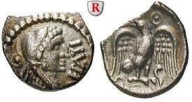Epaticcus ca. 25-35. Silbereinheit 10,5 mm ca. 25-35. Kopf r. mit Löwenfell, dahinter Ring EPATI / Adler von vorn mit geöffneten Schwingen und Schlange in den Fängen, Ring hinter dem Kopf. Van Arsdell 580-1; fast vorzüglich, Randabbruch