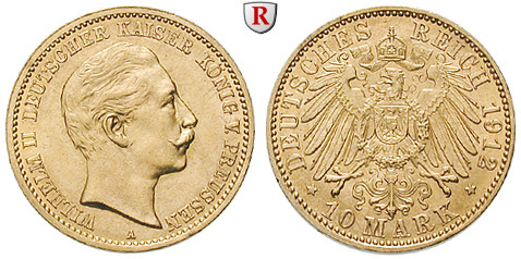 Wilhelm II. 1888-1918. 10 Mark 1912 A. J. 251; GOLD, vorzüglich / vorzüglich +