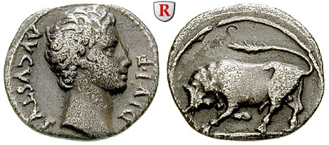 Augustus 27 v.-14 n.Chr. Denar 19 mm 15-13 v.Chr. Lyon. Kopf r. AVGVSTVS DIVI F / Stier stößt nach r., im Abschnitt (IMP X). RIC 169; sehr schön - vorzüglich, schöne dunkle Patina