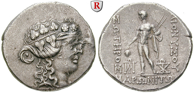 Tetradrachme um 100-80 v.Chr. Kopf des Dionysos r. mit Efeukranz / Dionysos l., hält Nebris, Speere und Weintrauben; Beizeichen Monogramme. Sch.-Geiss 1227; sehr schön - vorzüglich