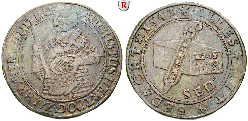 August der Jüngere 1635-1666. Reichstaler 1643 Zellerfeld. 4. Glockentaler. Dav. 6371; good very fine