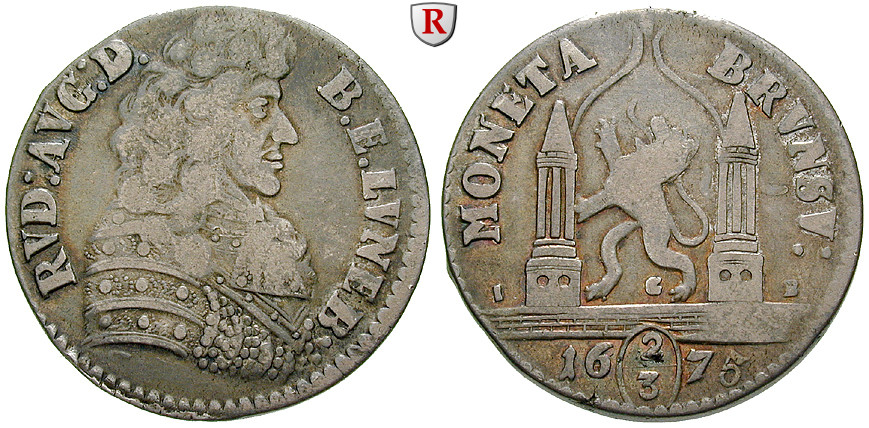 2/3 Taler 1675 IGB. Geharnischtes Brustbild Rudolf August von Braunschweig-Wolfenbüttel r. / Links schreitender Löwe zwischen den Türmen einer Stadtmauer. Dav. 451; sehr schön +, kl. Rdf.
