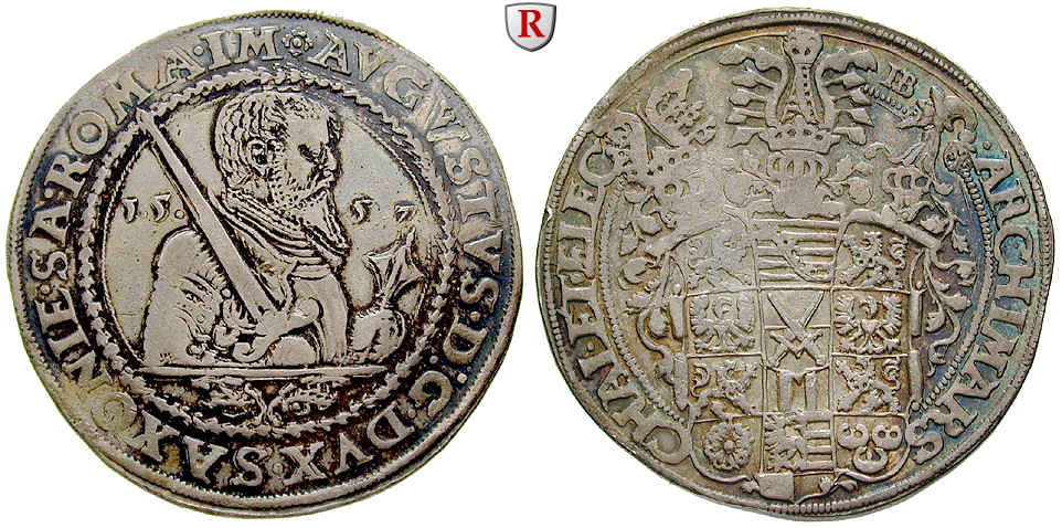 August 1553-1586. Taler 1557 Dresden HB. Brustbild r. mit Schwert, darunter kleine Wappen / Behelmtes Wappen, Mmz. HB. Dav. 9795; sehr schön + / vorzüglich, l. Prägeschwäche