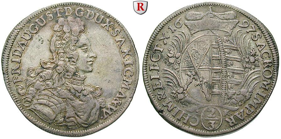 Friedrich August I. 1694-1733. 2/3 Taler 1697 Dresden IK. Dav. 817; very fine to extremely fine, small flan flaw at edge; adjustment marks on obv.