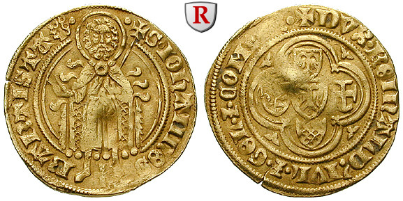 Arnold von Egmond 1423-1473. Goldgulden o.J. Stehender St. Johannes / Fünf Wappen im Vierpaß. Friedb. 56; GOLD, sehr schön +, Druckstelle