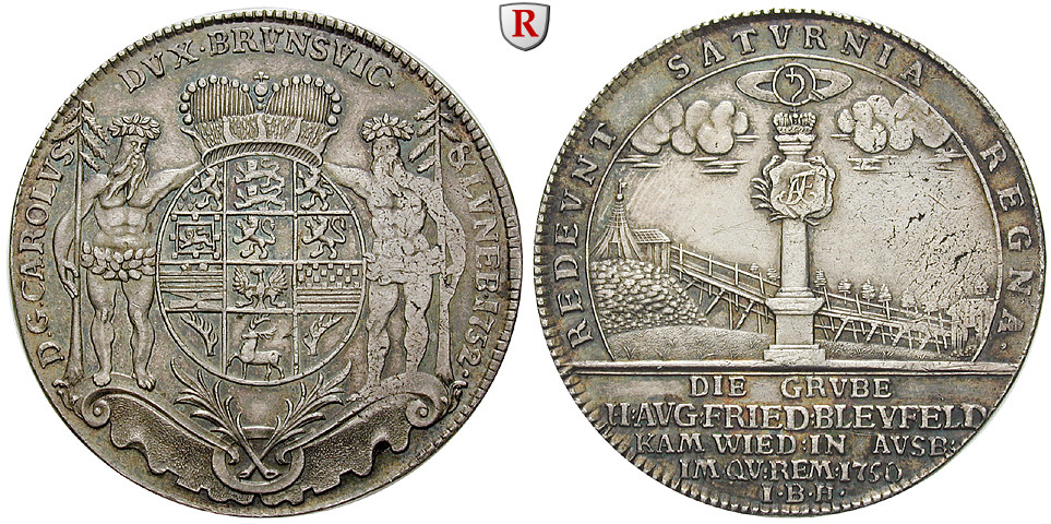 Karl 1735-1780. Reichstaler 1752 Zellerfeld IBH. Ausbeute der Grube Herzog Friedrich August Bleyfeld. Münzmeister Johann Benjamin Hecht. Zwei wilde Männer halten Wappen und je eine Tanne / Im Halbkreis: Säule mit Monogramm AF auf einem Schild vor Bergwerksanlagen; zw. den Wolken das Zeichen für Blei (Saturn). Dav. 2167; sehr schön - vorzüglich, Druckstelle auf Vs.