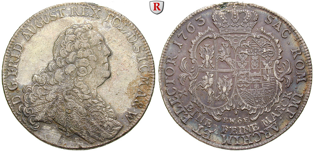 Friedrich August II. 1733-1763. Konventionstaler 1763 Dresden FWoF. Dav. 2676; sehr schön / sehr schön-vorzüglich, Hksp.; Vs. Felder geglättet