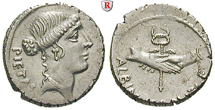 D. Iunius Brutus Albinus 48 v.Chr. Denar 18 mm 48 v.Chr. Rom. Kopf der Pietas r. PIETAS / ALBINVS BRVTI F Zwei Hände im Handschlag halten einen geflügelten Caduceus. Cr. 450/2; vorzüglich