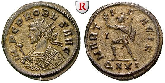 Zur Münzgeschichte: Trotz der wirtschaftlichen Erholung des Reiches - unter Probus gab es wieder Goldmünzen - blieb das beherrschende Münznominal der Antoninian mit seiner dünnen Silberauflage (Sudverfahren). Die Beizeichen auf den Prägungen (Buchstaben und Zahlen) nahmen zur Kontrolle der einzelnen Münzausgaben weiter zu und bildeten eine Vorstufe des ausgebauten Systems unter der Tetrarchie.