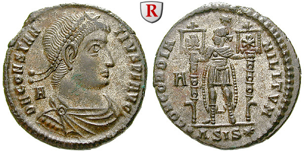 Eine der im Jahre 348 neu eingeführten Bronzemünzen zeigt, wie ein römischer Soldat einen gestürzten Reiter ersticht. Dieser ist aufgrund seiner Kopfbedeckung eindeutig als Perser ausgewiesen. Die Darstellung symbolisiert wohl Constantius II., den persischen König niederstechend.