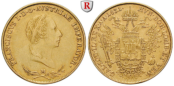 Franz II (I) 1792-1835. Sovrano 10.14 g fine, 1831 M Milan. Laureate bust right / Crowned arms. Friedb. 741c; GOLD, good very fine / very fine to extremely fine