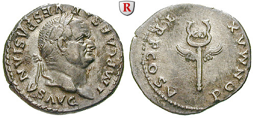 Zur Münzgeschichte: Vespasian gründete die neue Dynastie der Flavier und bestimmte direkt nach der Machtübernahme seine beiden Söhne Titus und Domitianus zu Nachfolgern als Caesaren. Auch durch seine Münzprägung versucht der Herrscher, diese Dynastie zu legitimieren. Von Anfang an prägten seine Söhne Titus und Domitianus Münzen mit ihren Portraits. Seltene Ausgaben besonders aus den ersten Regierungsjahren zeigen sogar alle drei Herrscher auf einer Münze.