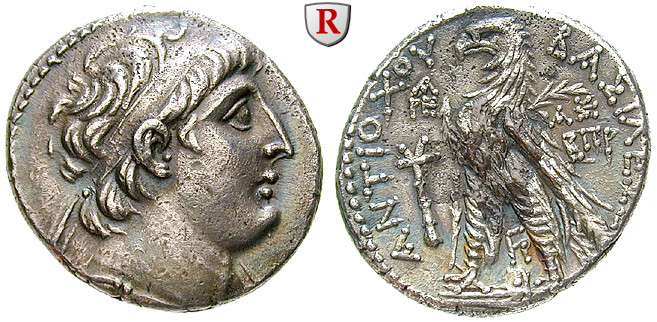 Antiochos VII. 138-129 v.Chr. Tetradrachme 28 mm 131-130 v.Chr. (Jahr 182) Tyros. Kopf r. mit Diadem / Adler l. mit Palmzweig auf Prora; in den Feldern: Keule, Datierung und Monogramme. SNG Spear 2082; fast vorzüglich, Hornsilber auf Rs.