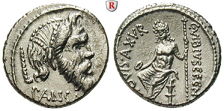 C. Vibius Pansa 48 v.Chr. Denar 19 mm 48 v.Chr. Rom. Maske des bärtigen Pan r., dahinter Pedum PANSA / C VIBIVS C F C N IOVIS AXVR Thronender Jupiter Axurus l., hält Schale und Zepter. Cr. 449/1b; vorzüglich, l. Korrosion im Feld der Vs.