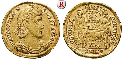 Constantius II 337-361. Solidus 21 mm 340-351 Nicomedia. Pearl-diademed, draped and cuirassed bust r. DN CONSTANTIVS PF AVG / GLORIA REI PVBLICAE Roma and Constantinopolis seated facing, supporting between them a wreath inscriped COT XX MVLT XXX, mintmark SMNC. RIC 31; GOLD, extremely fine, edge slightly tooled