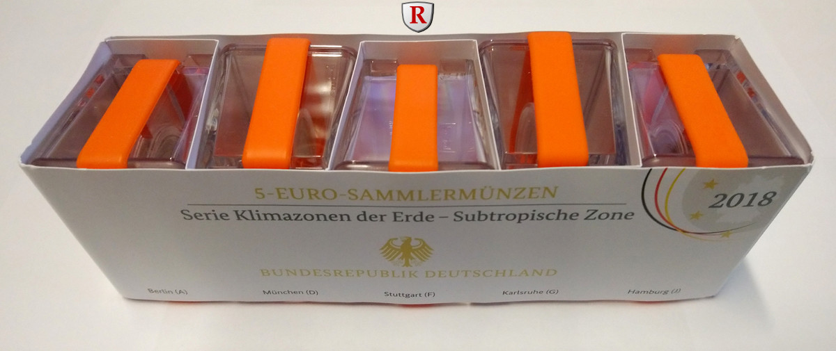 Kupfer-Nickel-5 Euro 2018 ADFGJ komplett. Subtropische Zone. Polierte Platte