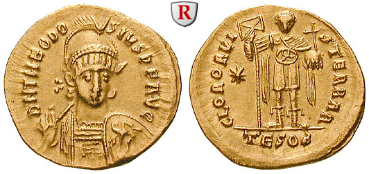 Theodosius II 402-450. Solidus 22 mm 443-450 Thessalonica. Diademed, helmeted, and cuirassed bust facing, holding spear over shoulder in right hand and shield decorated with horseman motif on left arm DN THEODOSIVS PF AVG / GLOR ORVIS TERRAR Emperor standing facing, holding labarum and globe surmounted by cross, star in l. field; mintmark TESOB. RIC 362; GOLD, extremely fine