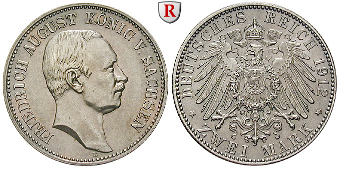 Friedrich August III. 1904-1918. 2 Mark 1912 E. J. 134; vorzüglich / vorzüglich-stempelfrisch, Patina
