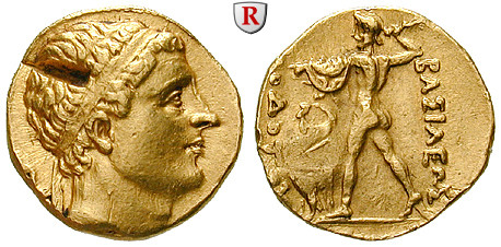 Diodotos I. 255-235 v.Chr. Stater 19 mm 255-235 v.Chr. Balkh. Im Namen Antiochos II. Kopf Diodotos I. r. mit Diadem / Zeus mit Blitz und Aegis, zu seinen Füßen ein Adler, Kranz im l. Feld. SNG ANS 75; GOLD, sehr schön - vorzüglich, Prüfhieb; Stempelf. auf Rs.