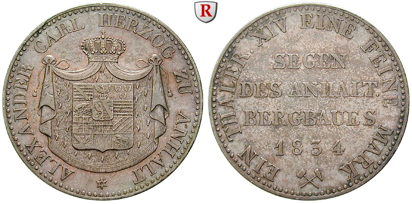 Alexander Carl 1834-1863. Ausbeutetaler 1834. AKS 15; sehr schön - vorzüglich