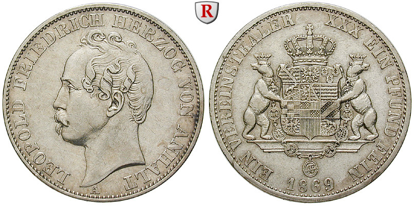 Leopold Friedrich 1817-1871. Vereinstaler 1869 A. AKS 30; sehr schön