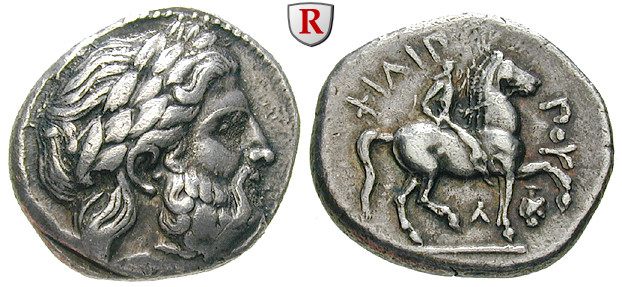 Philipp II. 359-336 v.Chr. Tetradrachme 25 mm 359-336 v.Chr. Amphipolis. Kopf des Zeus r. mit Lorbeerkranz / Nackter Reiter r. mit Palmzweig paradierend; Beizeichen Biene und Januskopf. LeRider 431; sehr schön +