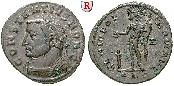 Constantius I., Caesar 293-305. AE-Follis 28 mm 301-303 Lyon. Gepanzerte Büste l. mit Lorbeerkranz CONSTANTIVS NOB C / GENIO POPVLI ROMANI Genius steht l., hält Schale und Füllhorn, vor ihm Altar, Mzz. A/PLC. RIC 167a; vorzüglich, l. belegt