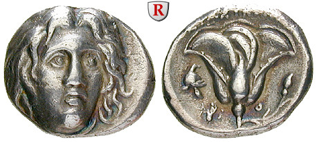 Didrachme 19 mm 265-250 v.Chr. Magistrat Erasikles. Kopf des Helios fast von vorn / Rose mit Knospe r., oben Magistratsname; Beizeichen P und Helm im l. Feld. SNG Cop. 738; sehr schön +