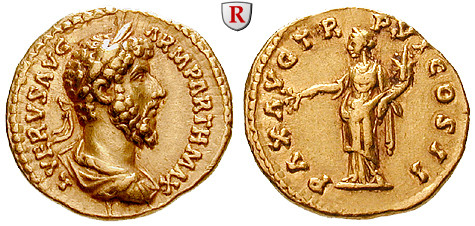 Zur Münzgeschichte: Lucius Verus galt als sehr eitel. Er war so stolz auf sein gelbes Haar, dass er es angeblich mit Goldstaub puderte, um den goldenen Glanz seiner Locken zu steigern. Den Bart ließ er fast nach Barbarenart lang wachsen. Die Münzen belegen diese Eitelkeit. Die schön frisierten Locken und der gepflegte Bart zieren ein beeindruckendes Portrait. Auf den Münzrückseiten werden häufig die militärischen Erfolge gefeiert. Armenia und Parthia, als Personifikationen der Länder, sitzen trauernd vor den siegbringenden römischen Waffen. Die Siegesgöttin Victoria hält einen Schild, dessen Aufschrift VIC(toria) PAR(thica) den Erfolg der römischen Armee verkündet.