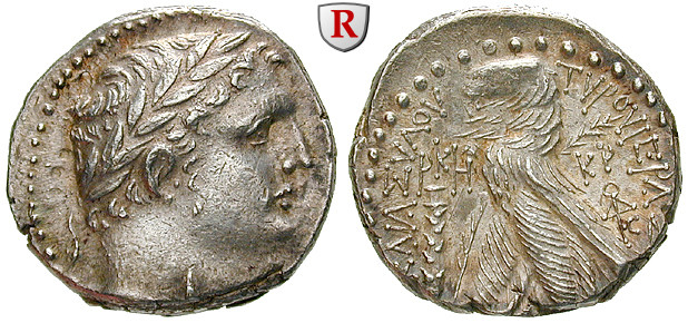 Herodes Archelaos 4 v.-6 n.Chr. Schekel 25 mm Jahr 128=2-3 n.Chr. Jerusalem. Kopf des Herakles Melkarth r. mit Lorbeerkranz / Adler mit Palmzweig l. auf Prora; Datierung, Keule und Monogramm in den Feldern; phönizischer Buchstabe zw. den Beinen. RPC Suppl. 4650B; vorzüglich