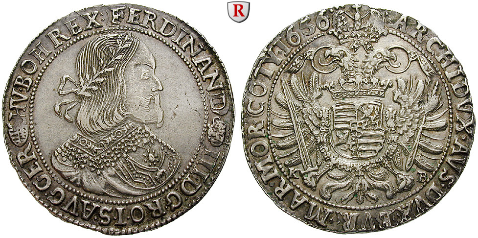 Ferdinand III. 1637-1657. Taler 1656 Kremnitz K-B. Brustbild r. / Gekr. Doppeladler mit Wappen auf der Brust. Dav. 3198; sehr schön-vorzüglich / vorzüglich