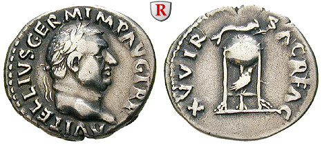 Zur Münzgeschichte: Die Münzstätte in Rom prägte erst vom 19. April an in Rom Münzen für Vitellius, an diesem Tag wurde er durch den Senat anerkannt. Das Geld, das Vitellius vorher benötigte, ließ er in Tarraco in Spanien und Lugdunum (Lyon) in Gallien prägen. Die Titulatur seiner Münzen weist einige Besonderheiten auf. Seit seiner Akklamation bezeichnete sich Vitellius als "Germanicus", diesmal nicht als Siegesname zu verstehen, sondern aufgrund seiner Erhebung in Germanien. Den Titel "Caesar" nahm er nie an und er erscheint auch nicht auf Münzen. Die Münzrückseiten betonen besonders den militärischen Aspekt der Treues des Heeres - FIDES EXERCITVVM - oder der Eintracht aller Bevölkerungsschichten - CONCORDIA. Sehr seltene Prägungen zeigen die Kinder des Herrschers - der zögerliche Versuch einer Dynastiegründung.