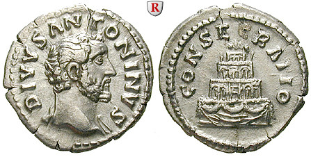 Antoninus Pius 138-161. Denarius after 161 Rome. Draped bust right DIVVS ANTONINVS / CONSECRATIO Pyre of four tiers, decorated with hangings and garlands, surmounted by quadriga. RIC 436; very fine to extremely fine