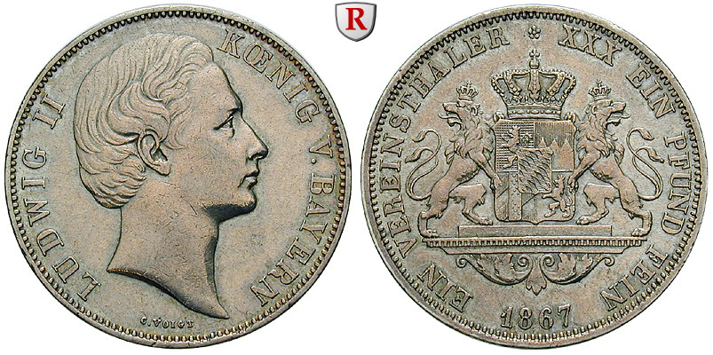 Ludwig II. 1864-1886. Vereinstaler 1867. Kopf ohne Scheitel. AKS 174; sehr schön - vorzüglich