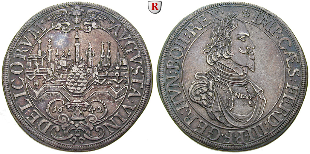 Reichstaler 1642. Mit Titel Ferdinand III. Stadtansicht, Pyr über Jahreszahl / Belorbeertes Brustbild rechts. Dav. 5039; sehr schön - vorzüglich