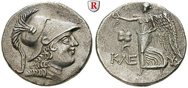 Tetradrachm 30 mm 205-100 BC. Kleuchares, magistrate. Head of Athena right, wearing crested Corinthian helmet / Nike advancing left, holding wreath, to left pomegranate. SNG Aul. 4797; very fine to extremely fine, minor corrosion at edge