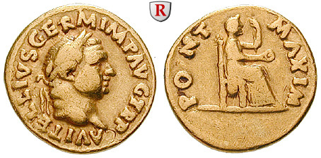 Zur Münzgeschichte: Die Münzstätte in Rom prägte erst vom 19. April an in Rom Münzen für Vitellius, an diesem Tag wurde er durch den Senat anerkannt. Das Geld, das Vitellius vorher benötigte, ließ er in Tarraco in Spanien und Lugdunum (Lyon) in Gallien prägen. Die Titulatur seiner Münzen weist einige Besonderheiten auf. Seit seiner Akklamation bezeichnete sich Vitellius als "Germanicus", diesmal nicht als Siegesname zu verstehen, sondern aufgrund seiner Erhebung in Germanien. Den Titel "Caesar" nahm er nie an und er erscheint auch nicht auf Münzen. Die Münzrückseiten betonen besonders den militärischen Aspekt der Treues des Heeres - FIDES EXERCITVVM - oder der Eintracht aller Bevölkerungsschichten - CONCORDIA. Sehr seltene Prägungen zeigen die Kinder des Herrschers - der zögerliche Versuch einer Dynastiegründung.