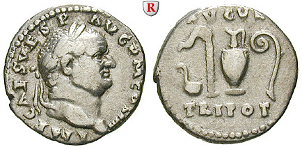 Zur Münzgeschichte: Vespasian gründete die neue Dynastie der Flavier und bestimmte direkt nach der Machtübernahme seine beiden Söhne Titus und Domitianus zu Nachfolgern als Caesaren. Auch durch seine Münzprägung versucht der Herrscher, diese Dynastie zu legitimieren. Von Anfang an prägten seine Söhne Titus und Domitianus Münzen mit ihren Portraits. Seltene Ausgaben besonders aus den ersten Regierungsjahren zeigen sogar alle drei Herrscher auf einer Münze.